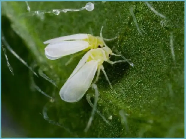 Různý hmyz se snaží pochutnávat si na šťávách z rajčatových listů. V důsledku takového parazitování začnou listy vadnout, žloutnout, kroutit se a zasychat. Svinování listů na rajčatech ve skleníku může nastat v důsledku parazitování mšicemi, sviluškami nebo molicemi. Tyto škůdce můžete vidět na fotografii níže.